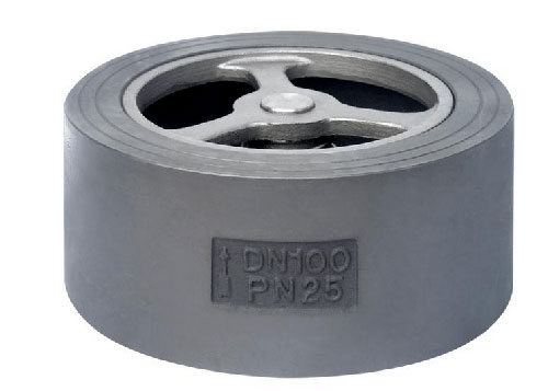 两块阀板沿着一个枢轴固定在阀体上,两条弹簧则装置在密封面上面的蝶板上。在介质流动压力的推动下,弹簧受压,迫使蝶板打开。当介质倒流时,弹簧则迫使阀门关闭。此种阀门可装配在水平管线和垂直管线上。
